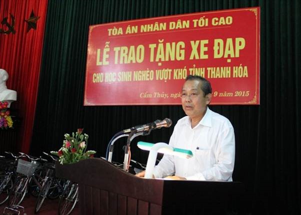 Chiều 11/9, tại Hội trường huyện Cẩm Thủy, thay mặt cán bộ, công chức ngành Tòa án, đồng chí Trương Hòa Bình, Bí thư Trung ương Đảng, Chánh án TAND tối cao đã trao tặng 100 chiếc xe đạp Thống Nhất cho học sinh nghèo hiếu học các huyện Cẩm Thủy, Ngọc Lặc, Thạch Thành (tỉnh Thanh Hóa).