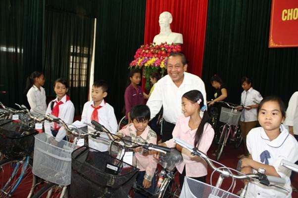 Chánh án TANDTC Trương Hòa Bình cùng Bí thư Tỉnh ủy Trịnh Văn Chiến trao xe đạp cho các em học sinh.