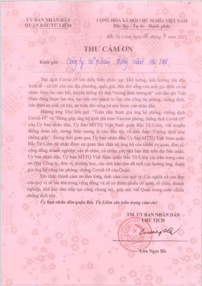 Với tâm thế ủng hộ Quỹ Vaccine là chia sẻ gánh nặng cho đất nước, hưởng ứng Lời kêu gọi của Đoàn Chủ tịch Ủy ban Trung ương MTTQ Việt Nam “Toàn dân đoàn kết, ra sức phòng, chống dịch bệnh Covid-19”, ngày 16/06/2021 Công ty Cổ phần Thống Nhất Hà Nội đã cùng chung tay đóng góp một phần nhỏ vào Quỹ Vaccine phòng, chống Covid-19 của Quận Bắc Từ Liêm. Những con số biết nói, những con số đầy tự hào đã phần nào thể hiện tinh thần đoàn kết, trách nhiệm với cộng đồng, với Tổ quốc, với nhân dân, chấp hành nghiêm quy định của Chính phủ, ngành y tế và của thành phố trong công tác phòng, chống dịch bệnh Covid-19. Toàn thể nhân dân đồng lòng, chung sức vì sức khỏe của mình và của cộng đồng, nỗ lực cao nhất để giữ được: khu dân cư an toàn, xã an toàn, huyện an toàn, tỉnh an toàn, góp phần để cả nước an toàn.