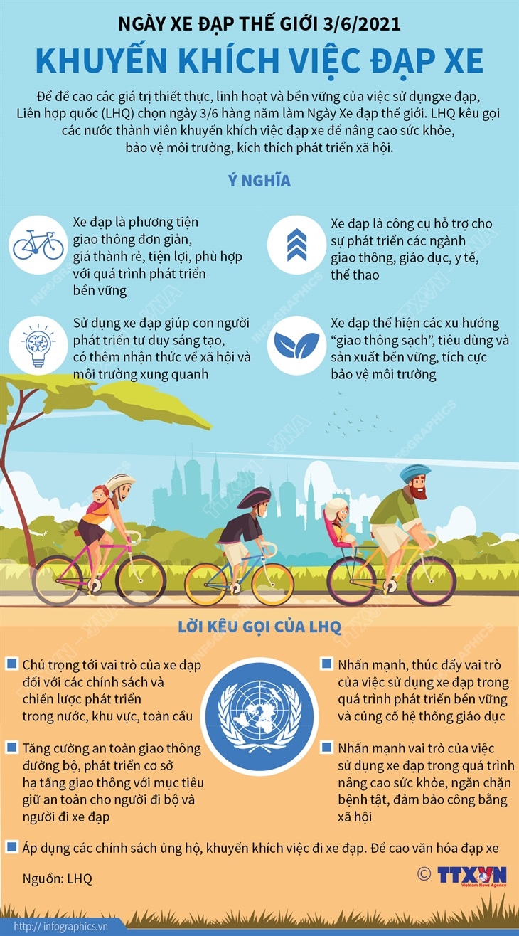 Để đề cao các giá trị thiết thực, linh hoạt và bền vững của việc sử dụng xe đạp, Liên hợp quốc (LHQ) chọn ngày 3/6 hàng năm làm Ngày Xe đạp thế giới. LHQ kêu gọi các nước thành viên khuyến khích việc đạp xe để nâng cao sức khỏe, bảo vệ môi trường, kích thích phát triển xã hội.