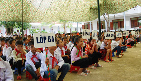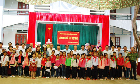 | Phó Thủ tướng Thường trực Trương Hòa Bình cùng phu nhân; lãnh đạo Tỉnh ủy, UBND tỉnh Lai Châu; đại diện Báo CAND; vợ chồng ông Lâm Tấn Lợi với thầy trò Trường THCS, Tiểu học Bản Giang |